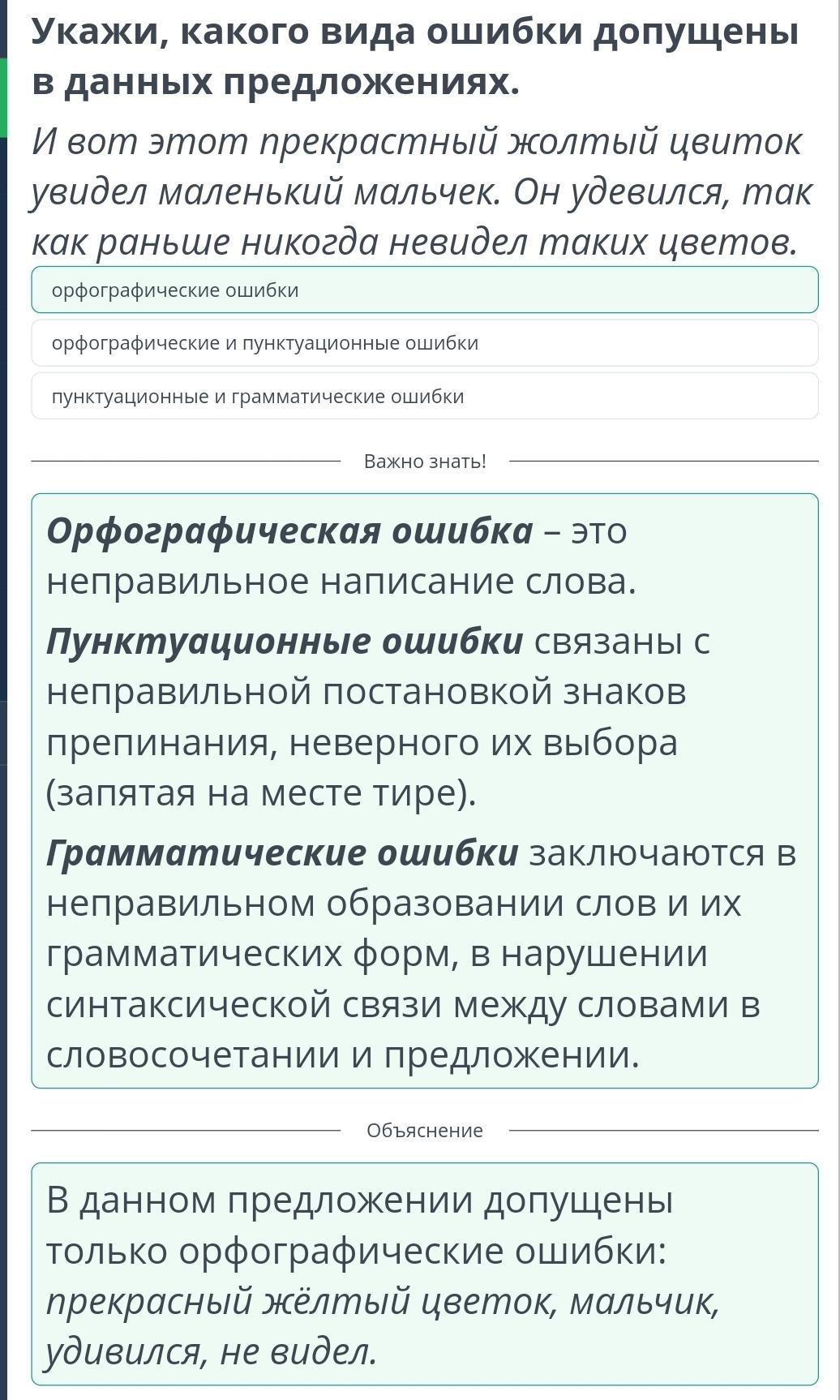 Укажи, какого вида ошибки допущены в данных предложениях. И вот этот прекрастный жолтый цвиток увидел маленький мальчек. Он удевился, так как раньше никогда невидел таких цветов, орфографические и пунктуационные ошибки пунктуационные и грамматические ошибки орфографические ошибки