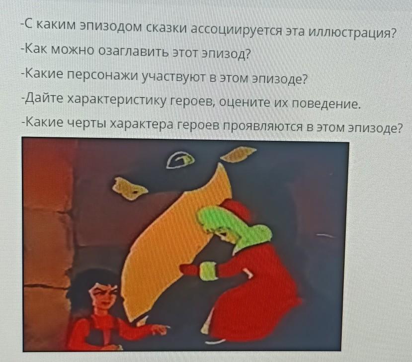 -С каким эпизодом сказки ассоциируется эта иллюстрация? -Как можно озаглавить этот эпизод? -Какие персонажи участвуют в этом эпизоде? -Дайте характеристику героев, оцените их поведение. -Какие черты характера героев проявляются в этом эпизоде?