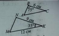 Трикутники ABC і MNK подібні. За рисунком знайти градусну міру кута M та довжину сторони AC.