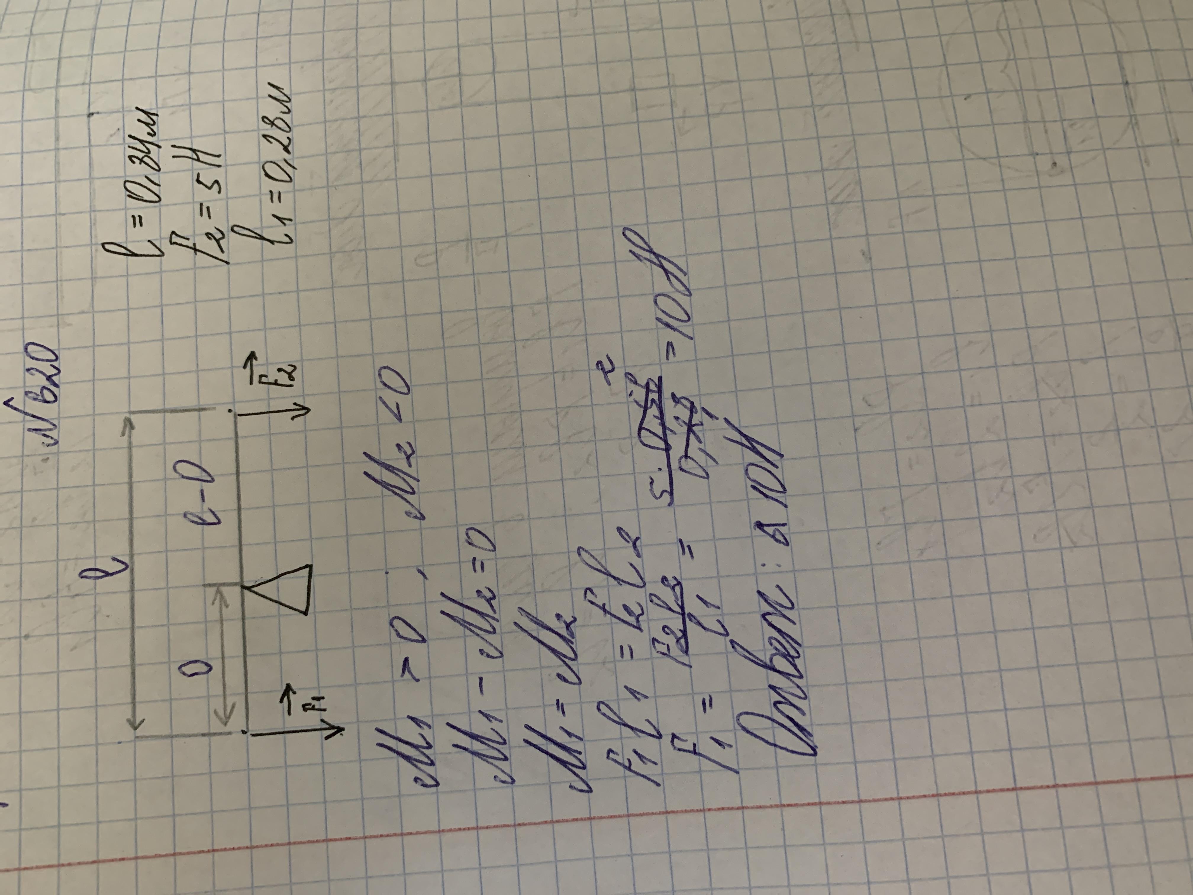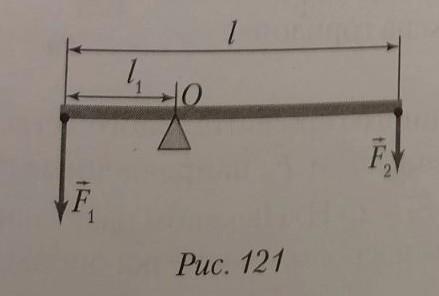 На рисунке 121 изображен легкий рычаг длиной 1 = 84 см. находящийся в равновесии. Определите модуль силы , если модуль силы F = 5,0 Н. Длина 4 = 28 см.