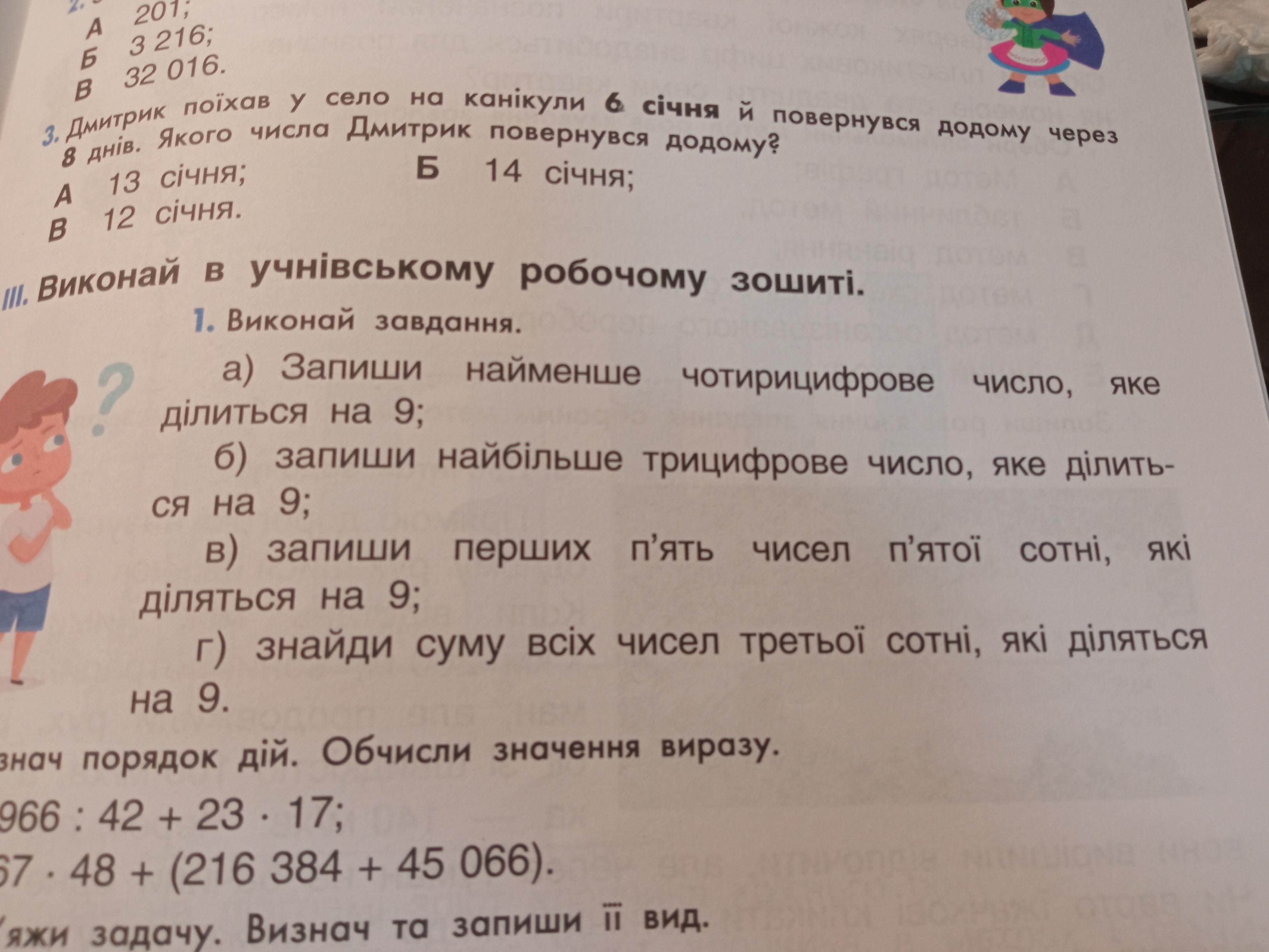 1 задание вариант г помогите пж даю 20 балов(плюсовать не обезательно)Перевод задания:Найди сумму всех чисел третей сотни которые делятся на 9