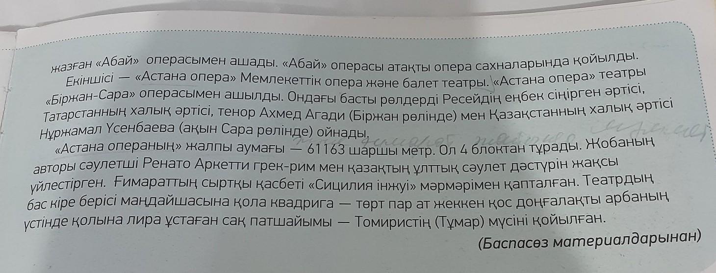 АЙТЫЛЫМ 5 -тапсырма. Мәтіндегі ақпаратты «Төрт сөйлем» тәсілін пайдаланып айт. Пікір. Оқыған мәтін бойынша пікіріңді бір сөйлеммен жаз. Дәлел. Өз пікіріңді бір сөйлеммен дәлелде. Мысал. Пікіріңді өмірмен байланыстырып, мысал келтір. Қорытынды. Тақырып бойынша қорытынды жаз.