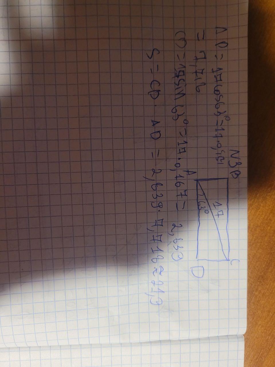 2. Диагональ АС прямоугольника ABCD равна 17 см и составляет со стороной AD угол в 63°. Найдите площадь прямоугольника ABCD.