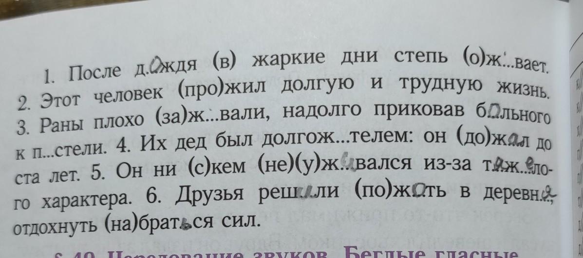 После дождя в жаркие дни степь оживает.Этот человек прожил долгую и трудную жизнь.Раны плохо заживали,надолго приковав боль ного к постели.Их дед был долго жителем: он дожил до ста лет.Он ни с кем не уживался из-зи тяжелого характера.Друзья решили пожить в деревне,отдохнуть набраться сил