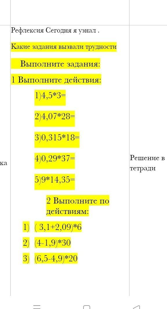 1.Заданиє:. 1)4,5×3=13,5. 2)4,07×28=113,96. 3)0,315×18=5,67. 4)0,29×37=10,73. 5)9×14,35=129,15. 2.Заданиє:. 1) (3,1+2,09)×6. 1 действиє: (3,1+2,09)= 5,19. 2 действиє: 5,19×6=31,14. 2)(4-1,9)× 30. 1 действиє: (4-1,9)=2,1. 2действиє: 2,1×30=63. 3)(6,5-4,9)×20. 1действиє: (6,5-4,9)=1,6. 2 действиє: 1,6×20=32. Честно никогда не любил ети десяточние дроби)