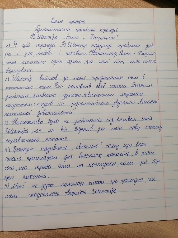 1) Галерею драматургів світової літератури відкриває В.Шекспір, тому що.. 2) Неможливо було не змінитися під впливом генія Вільяма Шекспіра, оскільки.... 3) "Ромео і Джульєтту" В.Шекспіра називають "світлою трагедією, тому що..... 4) Я хочу прочитати інші твори В.Шекспіра, тому що...