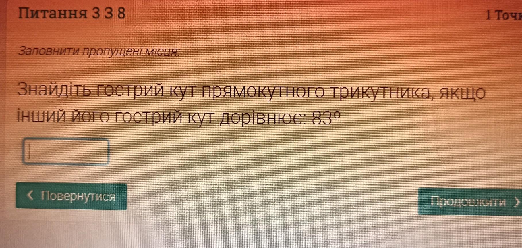Найдите острый угол прямоугольного треугольника, если другой его острый угол равен: 83º