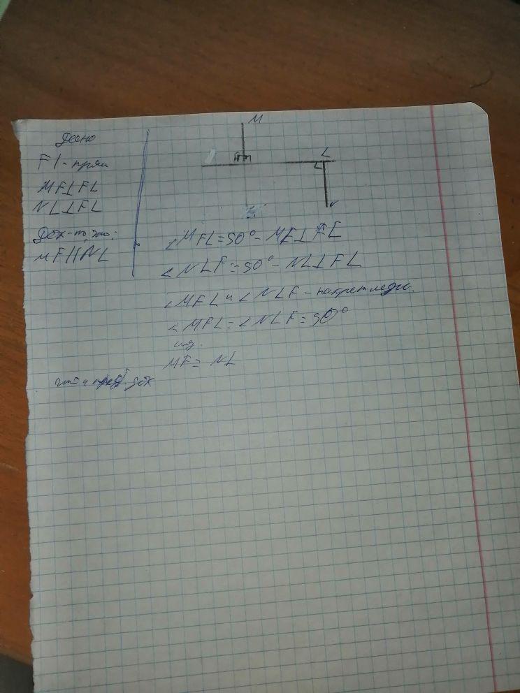 из точек m и n, которые расположены по разные стороны от прямой fl, проведены равные перпендикуляры mf и nl. докажи, что mf || nl.