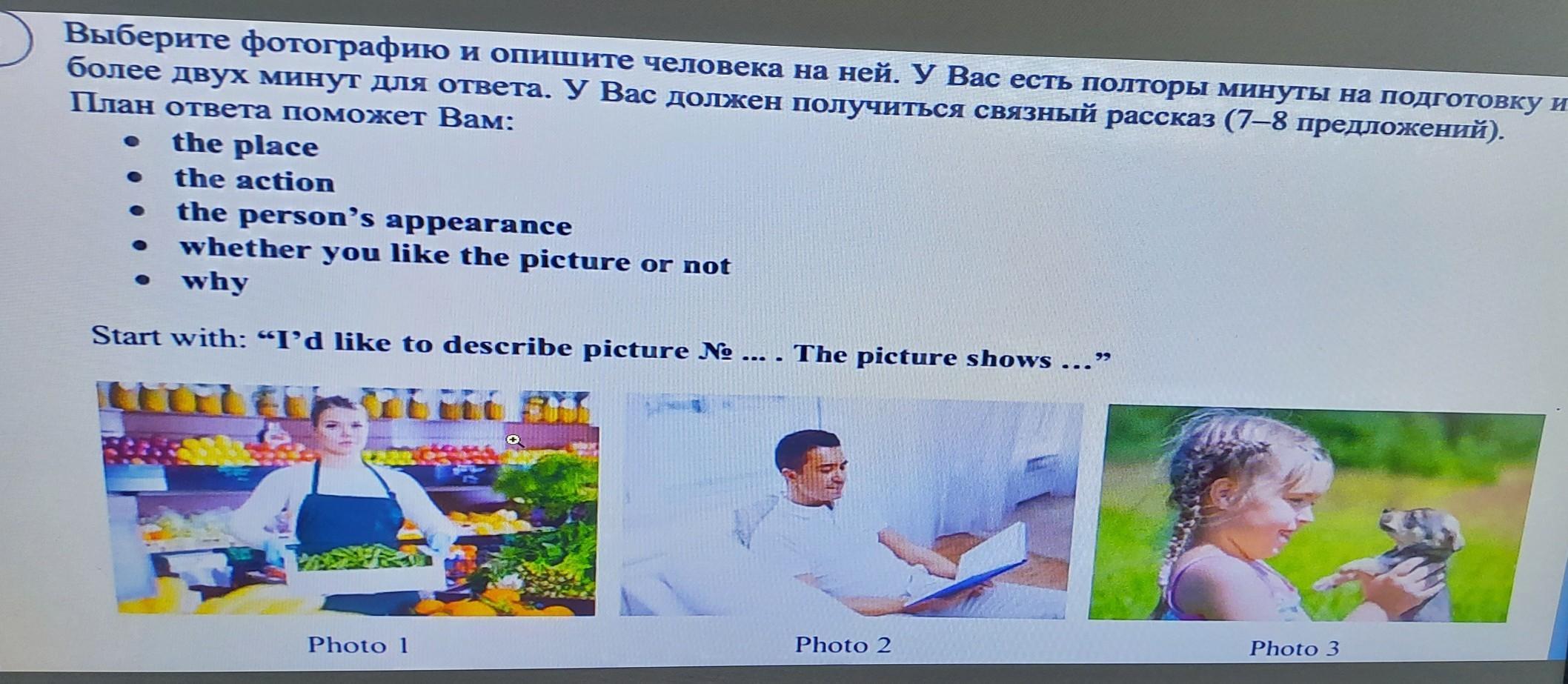 Выберите фотографию и опишите человека на ней. У Вас есть полторы минуты на подготовку и не более двух минут для ответа. У Вас должен получиться связный рассказ (7-8 предложений). План ответа поможет Вам: the place the action the person's appearance whether you like the picture or not why Start with: "I'd like to describe picture No ... . The picture shows ..." Photo 3 Photo 2 Photo 1