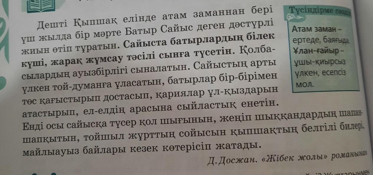 Менің атам Дешті Қыпшақ елінде үш жылда бір рет Батыр Сайыс деген дәстүрді өткізетін . Бұл сайыста батырлардың білек күші , жарық жұмсау тәсілі сынға түседі . Сайыстың арты Тойға ұласатын. Қариялар ұл-қыздарын атастырып, елде сыйластық орын алатын . Осы сайыста кім жеңіп шықса соған шапан- шапқытан байлар , билер кезек көтерісіп жатады .