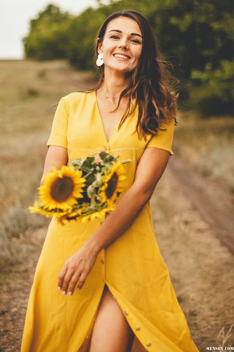 Das Mädchen ist sehr hübsch, sie hat zwei Unterhosen in ihren Händen. Das Haar ist üppig, lockig. Große silberne Ohrringe an den Ohren. Sie trägt ein süßes gelbes Kleid. Es ist ein süßes, strahlendes und blendendes Lächeln im Gesicht.