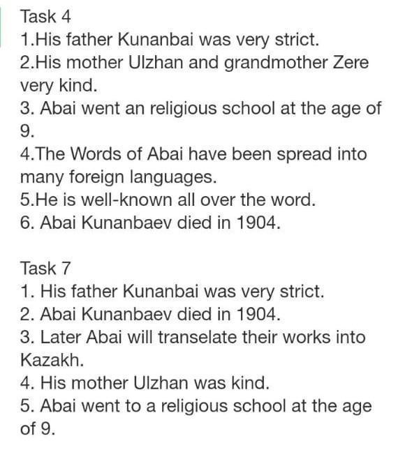 Test1. His father Kunanbai was very……a) strictb) simplec) sell2. Abai Kunanbaev died….. 1904.a) inb) toc) at3. Later Abai …theirs works into Kazakh.a) to translateb) translatedc) will translate4. His mother Ulzhan was…….a) kindb) unkindc) impolite5. Abai went to a religious school at the age of ….a) 9b) 10c) 8