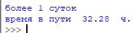 Задание. Расстояние от Алматы до Кокшетау составляет 1614 км. Поезд двигался равномерно со скоростью 50 км/ч. За сколько времени поезд доедет до места назначения? Если время превышает 24 часа, то необходимо вывести сообщение «более 1 суток».