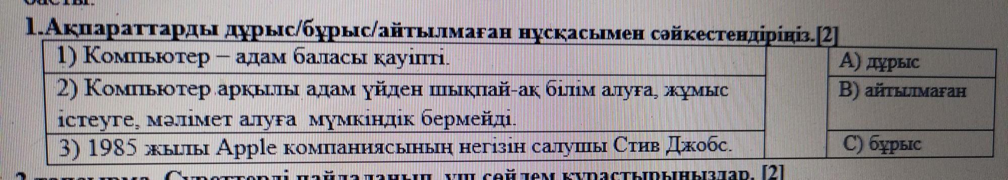 1. Ақпараттарды дұрыс/бұрыс айтылмаған нұсқасымен сәйкестендіріңіз.[2] 1) Компьютер – адам баласы қауіпті. А) дұрыс В) айтылмаған 2) Компьютер арқылы адам үйден шықпай-ақ білім алуға, жұмыс істеуге, мәлімет атуға мүмкіндік бермейді. С) бұрыс 3) 1985 жылы Apple компаниясының негізін салушы Стив Джобс. ___ х патта І патша Ш плар 2