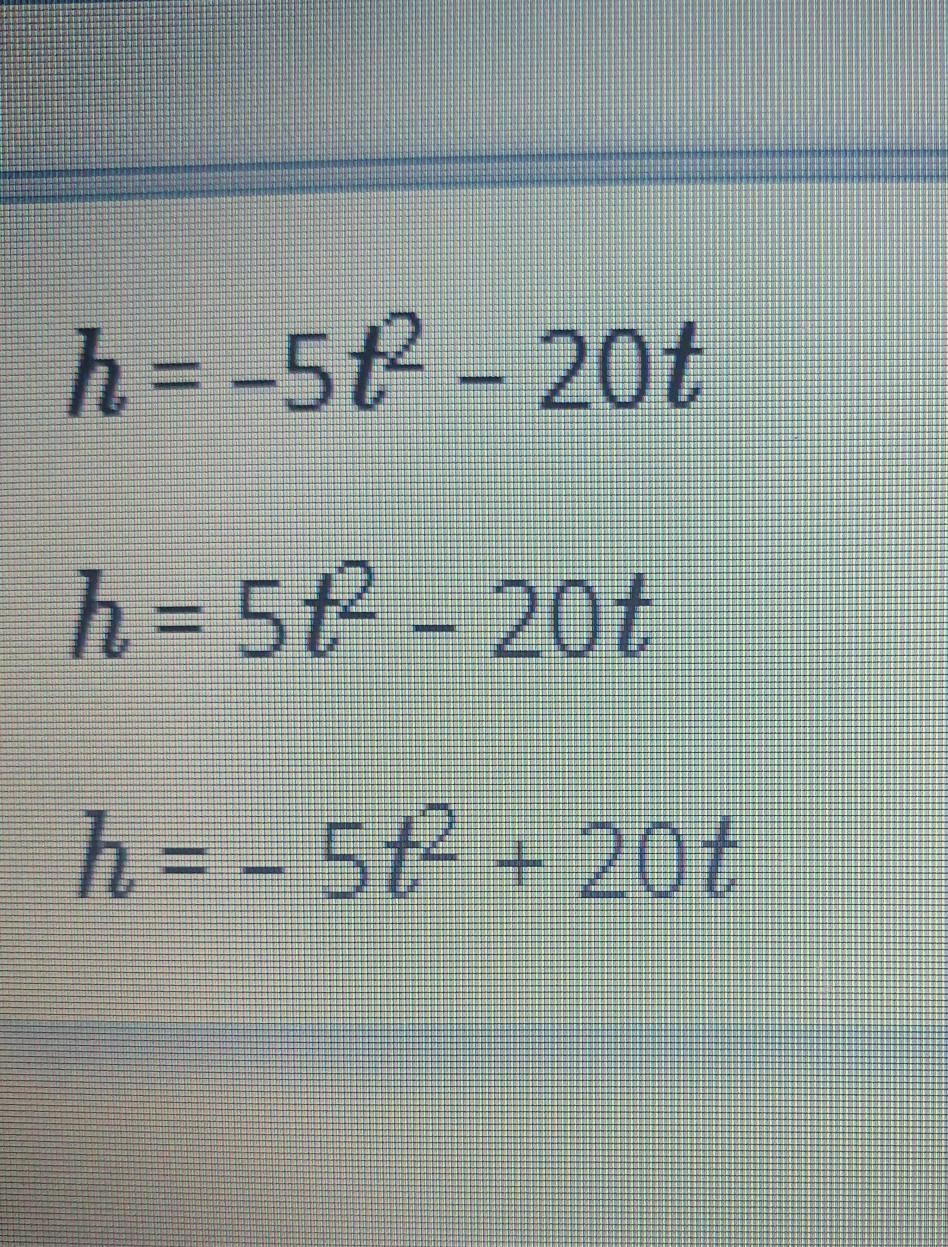 Футболист во время тренировок бросил мяч вертикально вверх с начальной скоростью 20 м/с. Полагая, что g= 10 м/с2, напиши формулу зависимости высоты от времени.