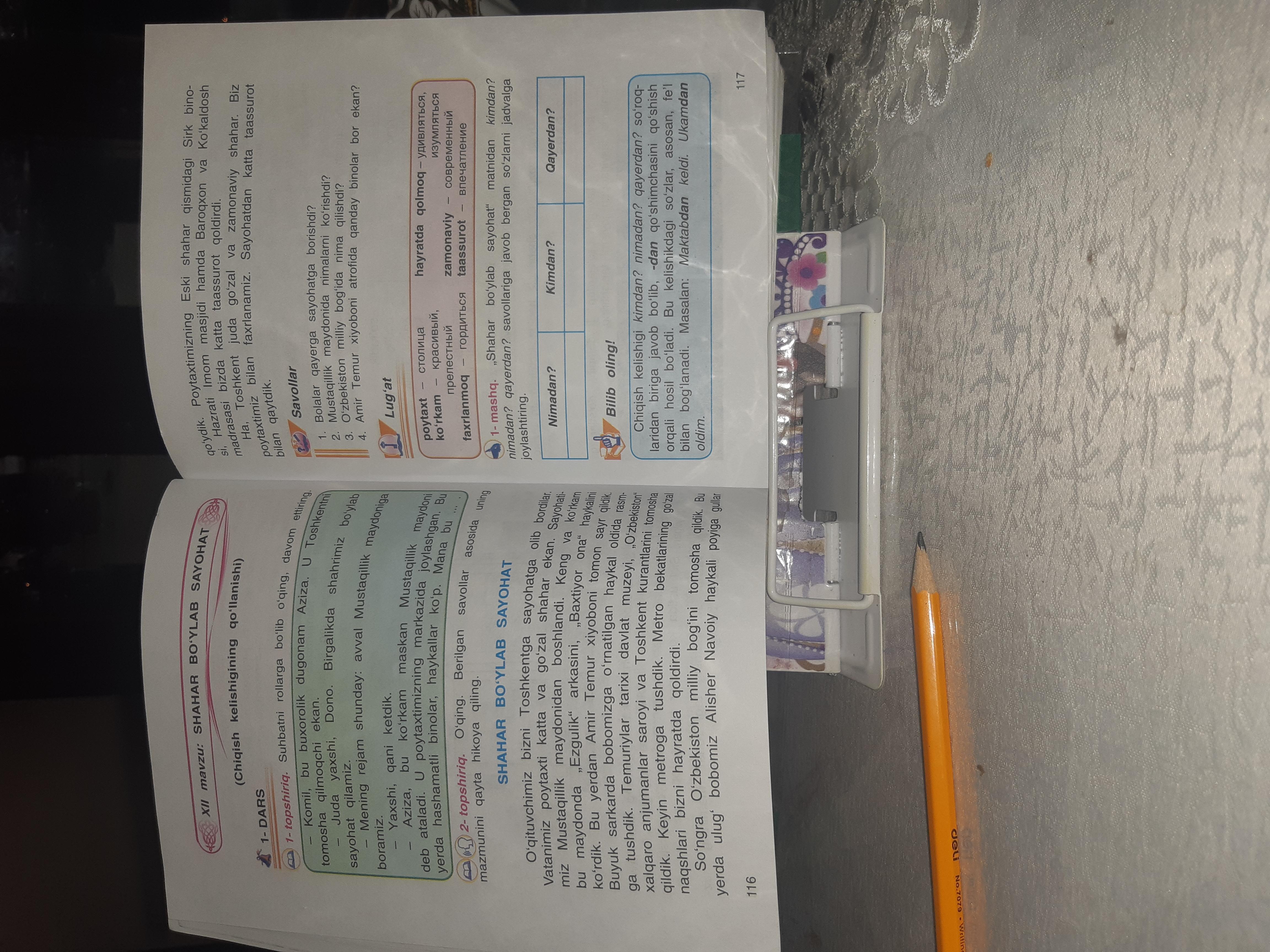 Помогите срочно пж! 1 mashq "Shahar boylab sayohat"matnidan kimdan?nimadan?qayerdan? savollariga javob bergan sozlarni jadvalga joylashtiring.