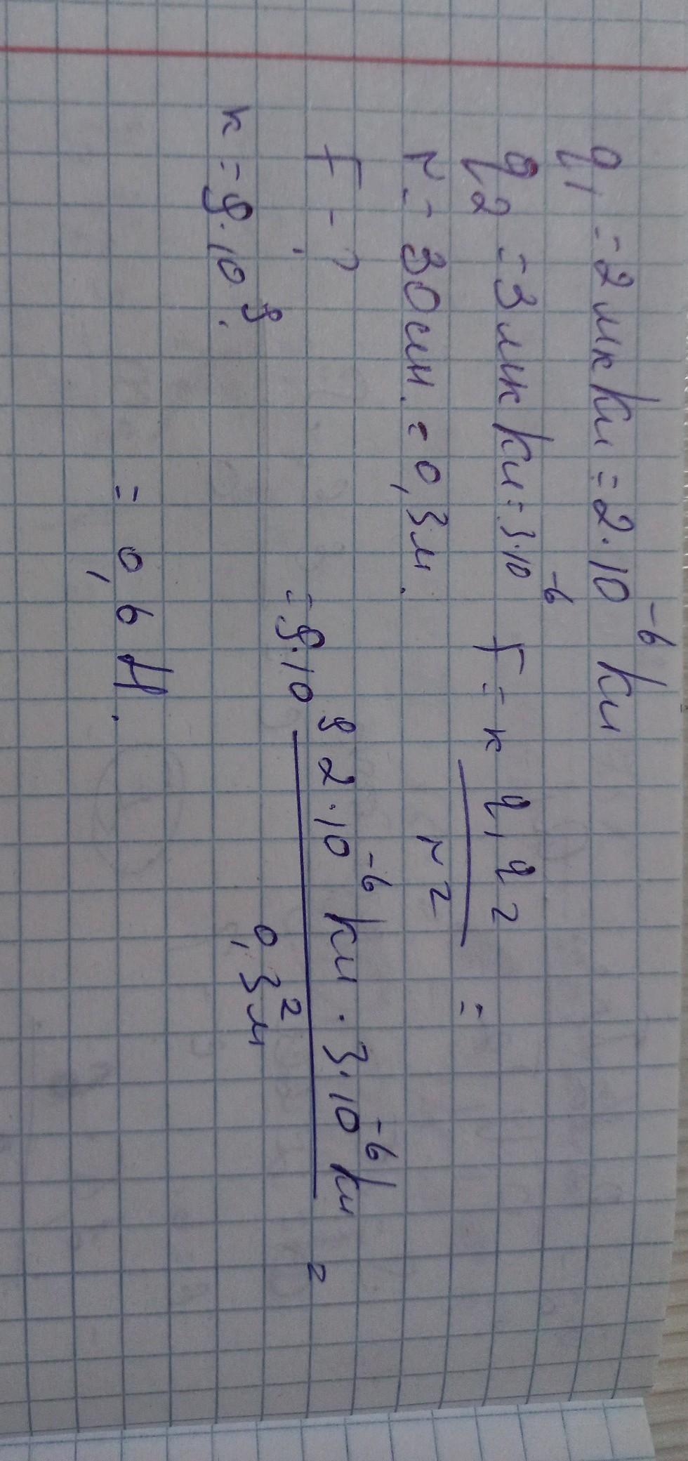 Найдите модуль силы (в Н) взаимодействия между зарядами 2 мкКл и 3 мкКл, если расстояние между ними равно 30 см. Ответ округлите до сотых.