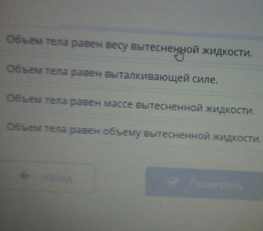 Ответ: Объем тела равен объему вытесненной жидкости