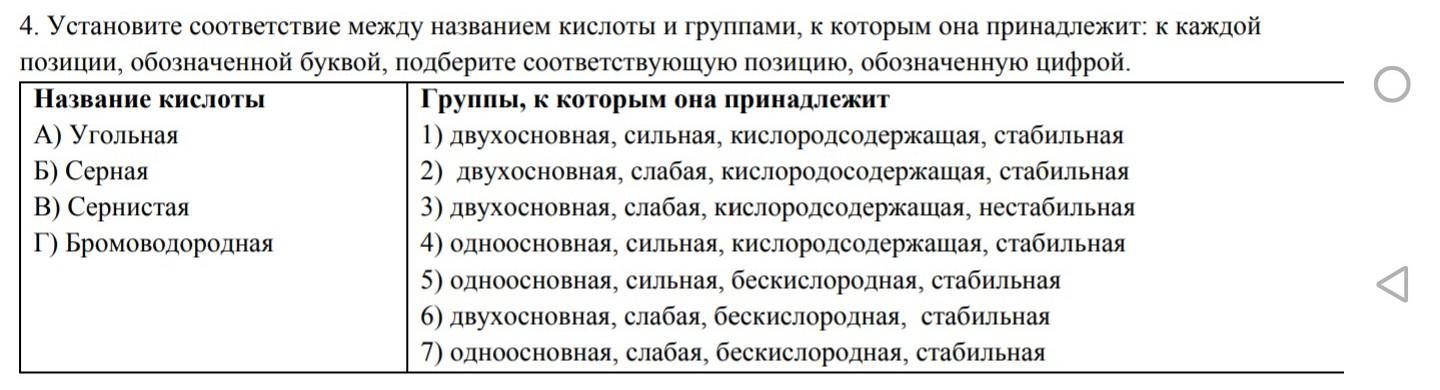 Установите соответствие между названием кислоты и группами, к которым она принадлежит к каждой позиции, обозначенной буквой, подберите соответствующую позицию, обозначенную цифрой.