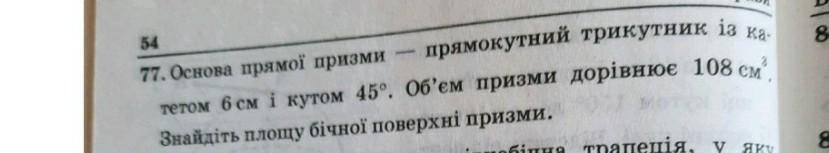 Один з кутів прямокутного трикутника, що лежить в освнові даної прямої призми 45 градусів, значить і другий кут дорівнює 45 градусів (90-45=45 або 180-90-45=45).