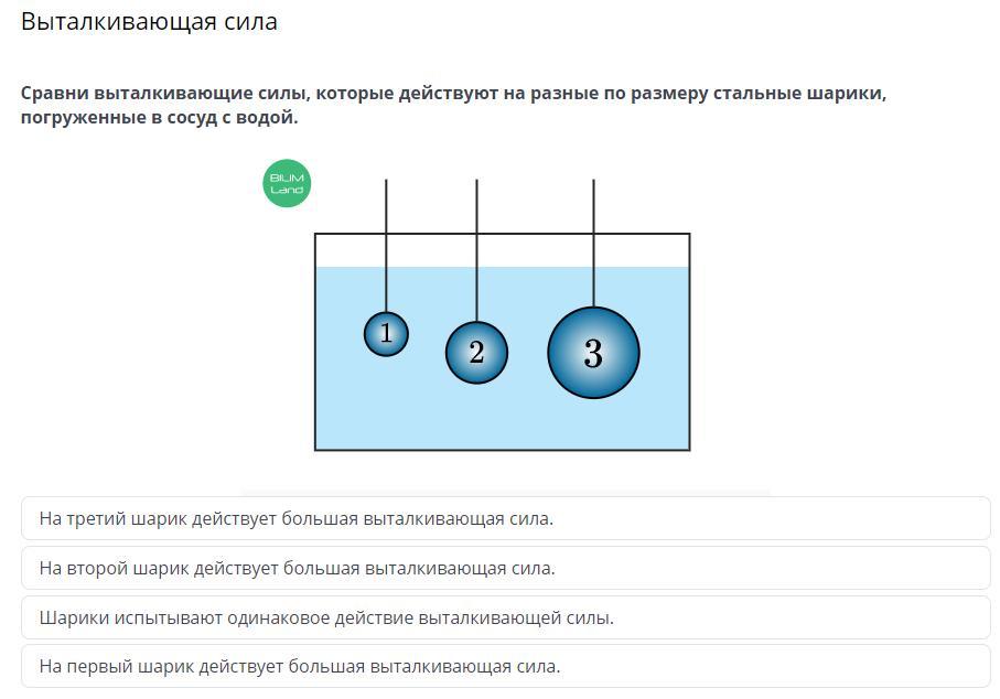 Согласно закону Архимеда, на любое тело, погруженное в жидкость или газ, действует выталкивающая сила, направленная вертикально вверх. Выталкивающая сила зависит от плотности жидкости и объема тела, погруженного в жидкость. Чем больше объем тела, тем больше выталкивающая сила. Из трех шаров третий шар имеет самый больший объем, следовательно, на него действует большая сила выталкивания.