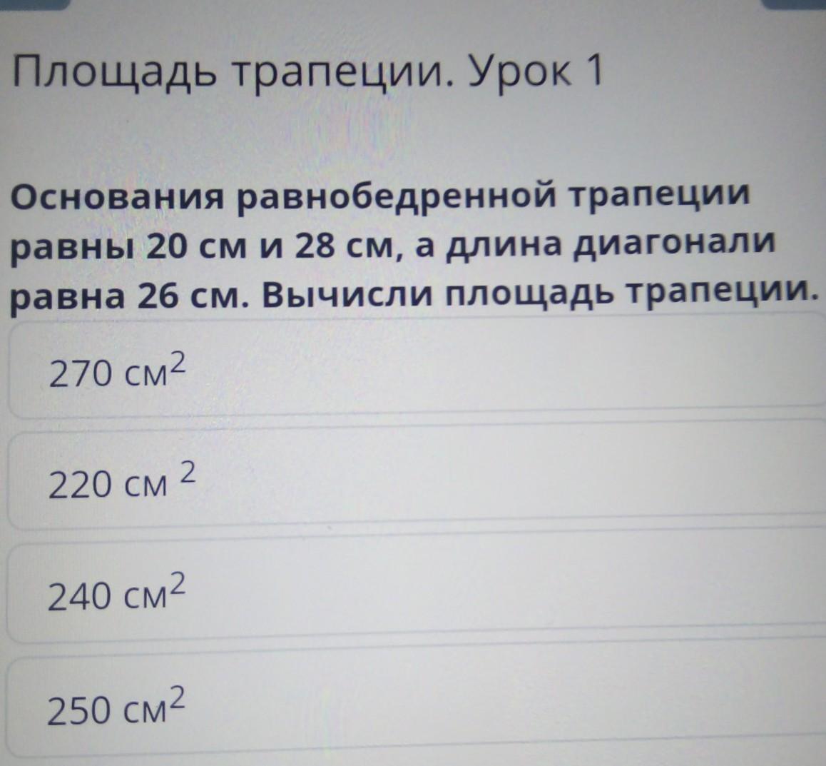 Площадь трапеции. Урок 1 Основания равнобедренной трапеции равны 20 см и 28 см, а длина диагонали равна 26 см. Вычисли площадь трапеции. 270 см² 220 см² 240 см² 250 см²