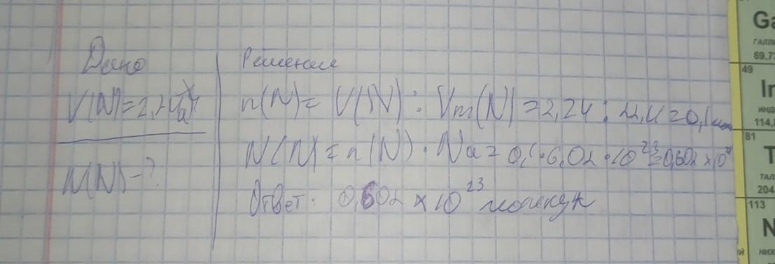 Яка кількість речовини азоту N, об'ємом 2.24 л (н.у.)? Скільки молекул азоту там міститься?
