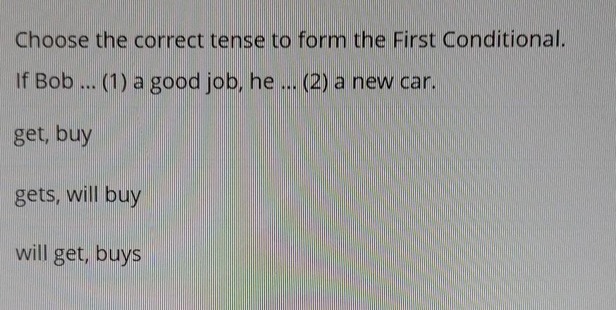 Choose the correct tense to form the First Conditional. If Bob ... (1) a good job, he ... (2) a new car. get, buy gets, will buy will get, buys