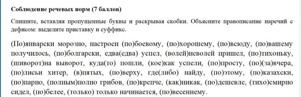 По - январски морозно, настроен по-боевому, по-хорошему, повсюду, по-вашему получилось, по - болгарски, едва-едва успел, волей-неволей пришёл, потихоньку, шиворот-навыворот, куда-то пошли, кое-как успели, попросту, позавчера, по-лисьи хитёр, в-пятых, поверху где-либо найду, поэтому, по-казахски, попарно, полным-полно грибов, покрепче, как-никак, подешевле, тихо смирно сидел, побелее, только-только начинается, по-весеннему