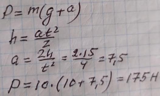 Даю максимальное количество баллов!! Груз массой 10 кг стоит на весах на полу лифта. Лифт начинает равноускоренно поднимается вверх. Что покажут весы, если лифт поднялся на 15 м в течение 2 с?