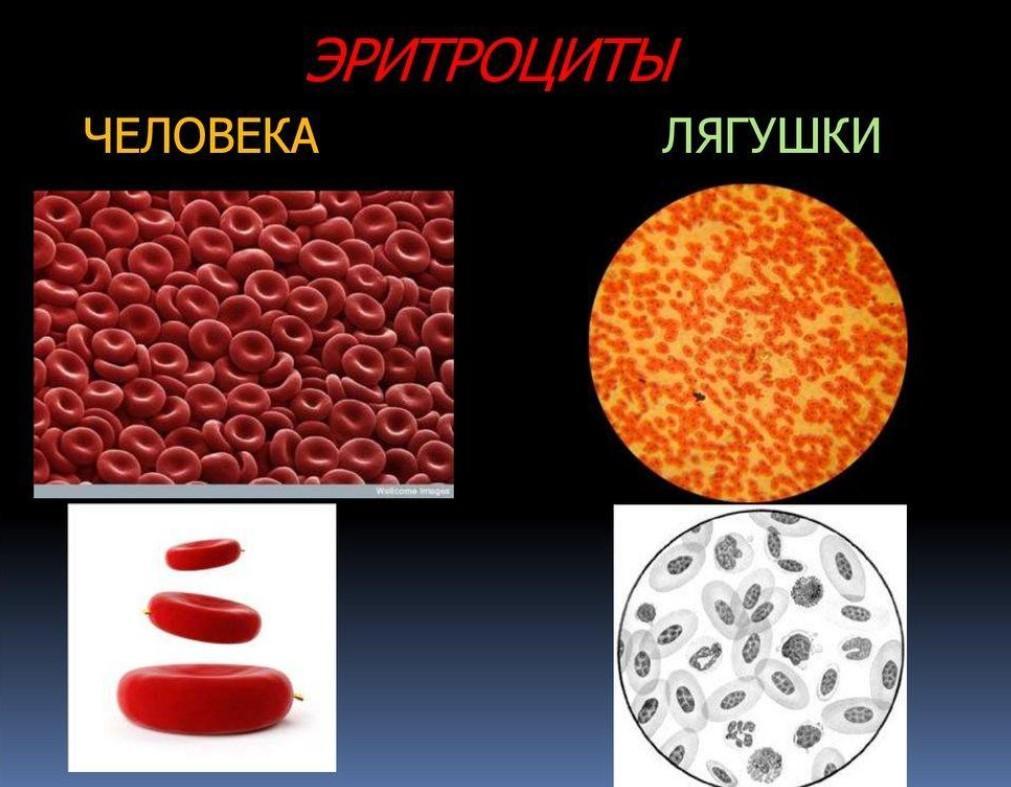 - Эритроциты лягушки больше эритроцитов человека. Имеют овальную двояковыпуклую форму и ядро. Эритроциты человека мельче, без ядра и имеют двояковогнутую форму.