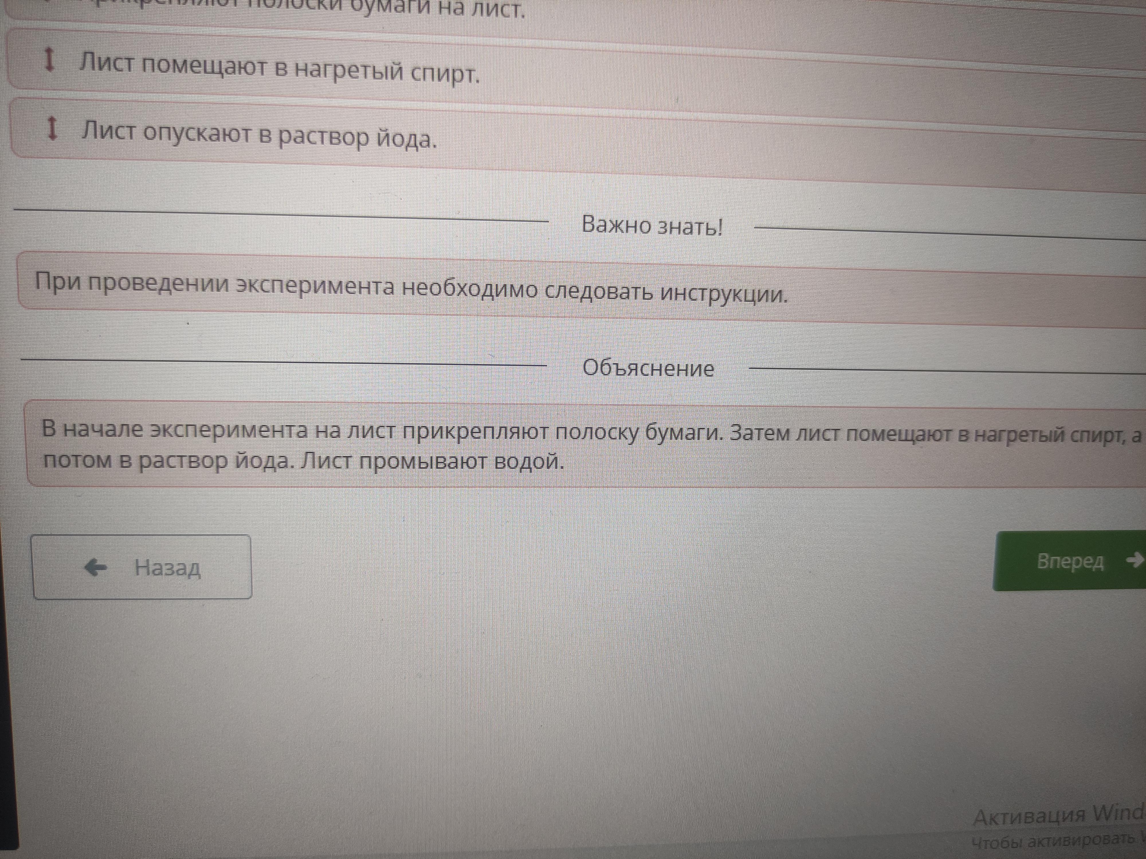 Определи правильную последовательность этапов эксперимента с окрашиванием листа в йодном растворе. І Лист помещают в нагретый спирт. 1 Прикрепляют полоски бумаги на лист. І Лист опускают в раствор йода. І Лист промывают водой.