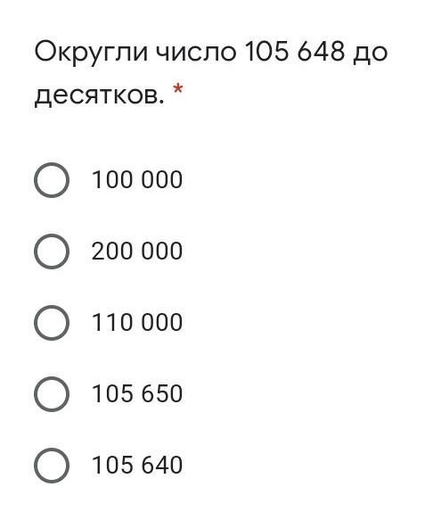 105648. Что-бы округлить данное число до десятков нужно посмотреть на числа которые нам не нужно будет округлять.