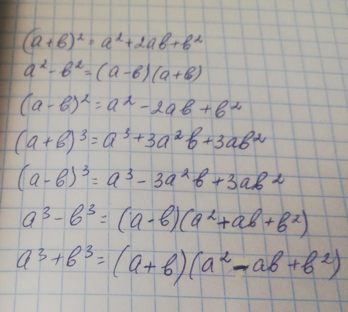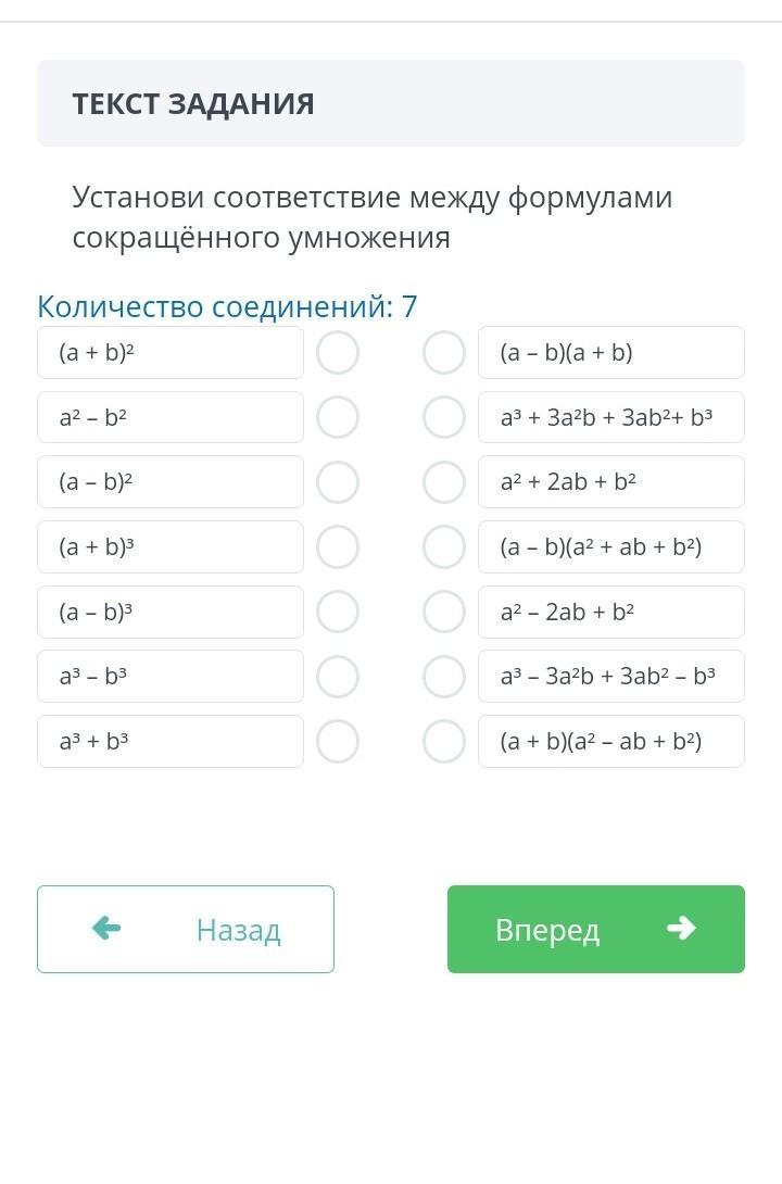 Установи соответствие между формулами сокращённого умножения Количество соединений: 7 (a + b)2 (a - b)(a + b) a2 - b2 a3 + 3a2b 3ab2+ b3 (a b)2 a2 + + b2 (a + b)3 - b)(a2 + b2) (a - b)3 a2 2ab + b2 a3 - b3 a3 3a?b + 3ab2 - b3 a3 + b3 10 (a + b)(a2 - ab + b2)