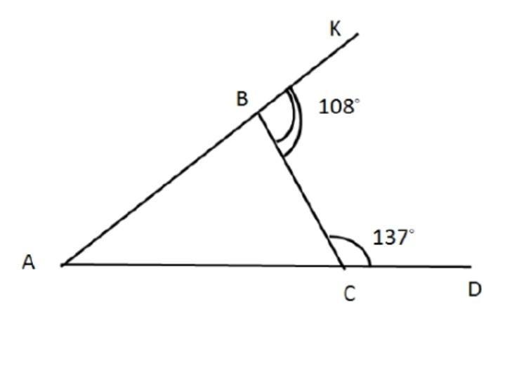 ∠КВС = 108° - внешний угол ΔАВС при вершине В, он равен сумме внутренних углов треугольника не смежных с ним: