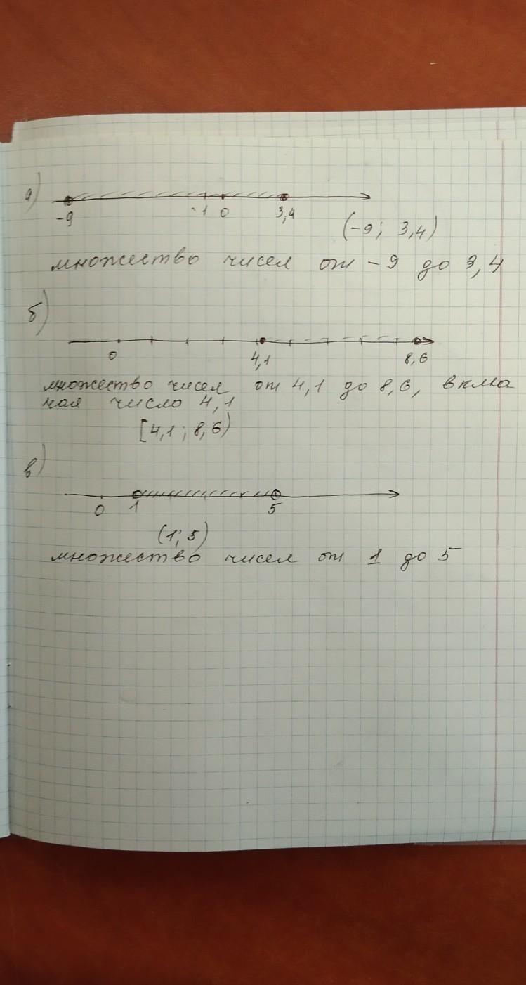 Изобразите на координатной прямой промежуток, задаваемый условием и укажите как он называется : а) -9 <х <3,4; б) 4,1 ≤х <8,6; в) 1 <х <5