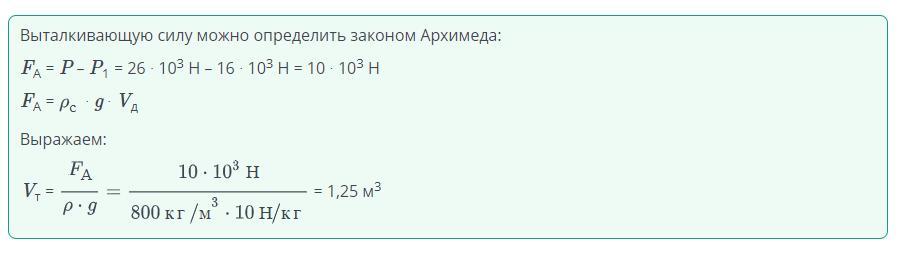 Вес тела в воздухе равен 26 кН, а в керосине - 16 кН. Определи объем тела. ( р. = 800 кг/м3)