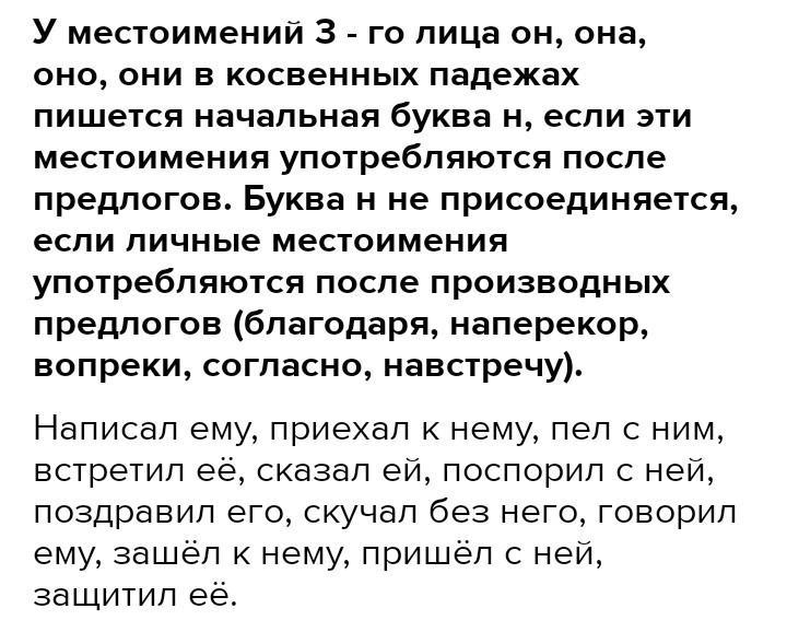 У местоимений 3 - го лица он, она, оно, они в косвенных падежах пишется начальная буква н, если эти местоимения употребляются после предлогов. Буква н не присоединяется, если личные местоимения употребляются после производных предлогов (благодаря, наперекор, вопреки, согласно, навстречу).