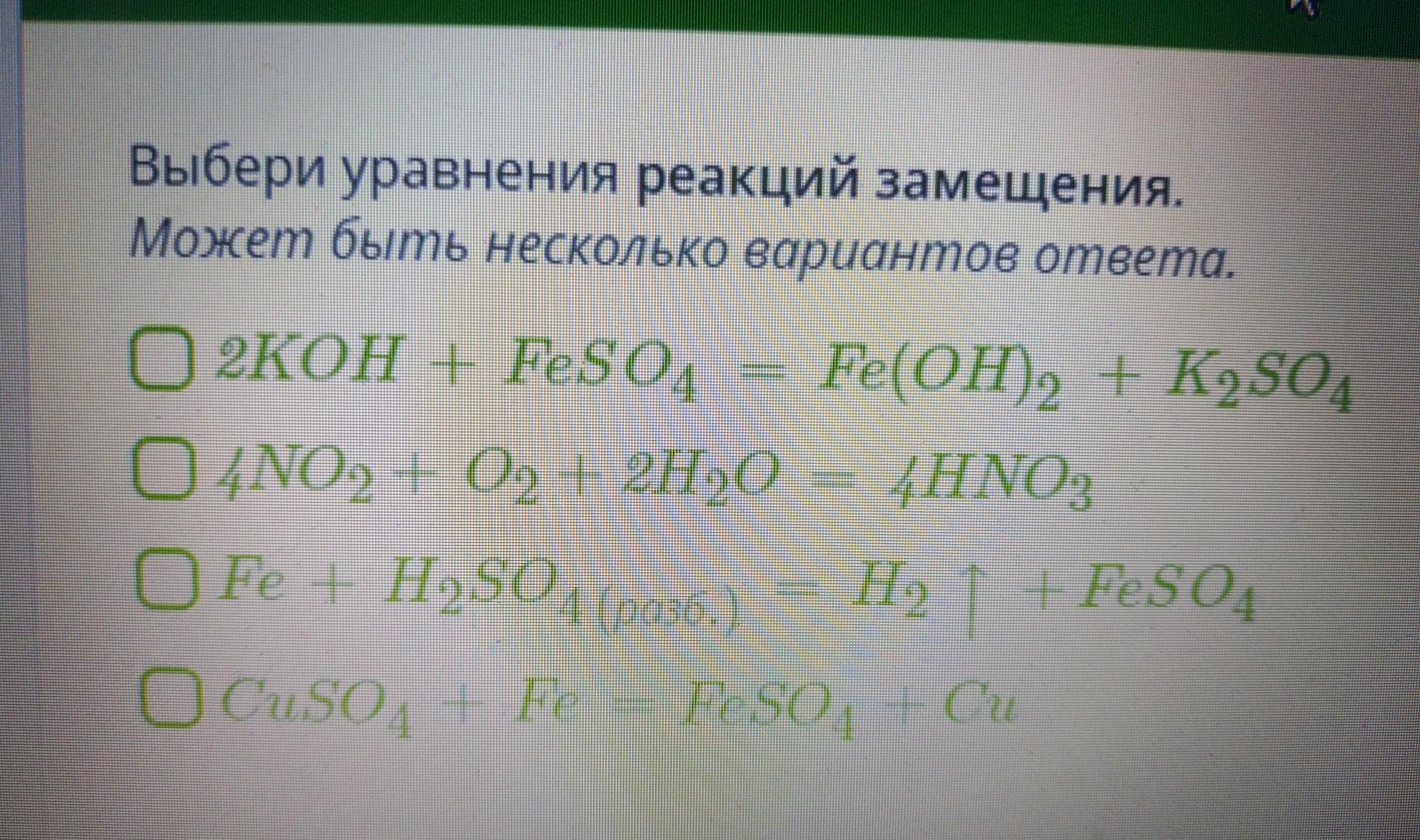 СРОЧНО ПОМОГИТЕ ПОЖАЛУЙСТА ДАЮ 30 БАЛОВ. Выбери уравнения реакций замещения. Может быть несколько вариантов ответа. 2KOH 4 FeSO4 Fe(OH)2 + K2SO4 + 04NO, + 0 + 0 + 4HNO, + 2790 Fe + H2SO4) = H2 + FeSO4 1 O CuSO4 + Fe = FeSO4 Cu Ch50 , + Lot