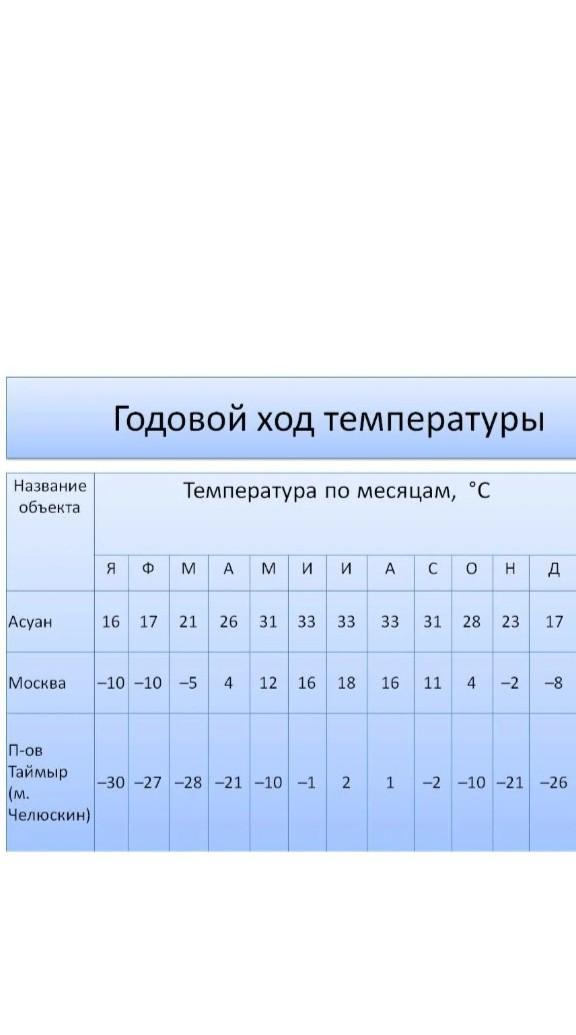Помогите найти среднию годовю температу и годовую амплитуду Асуан, Москва, п-ов таймыр м. Челюксин