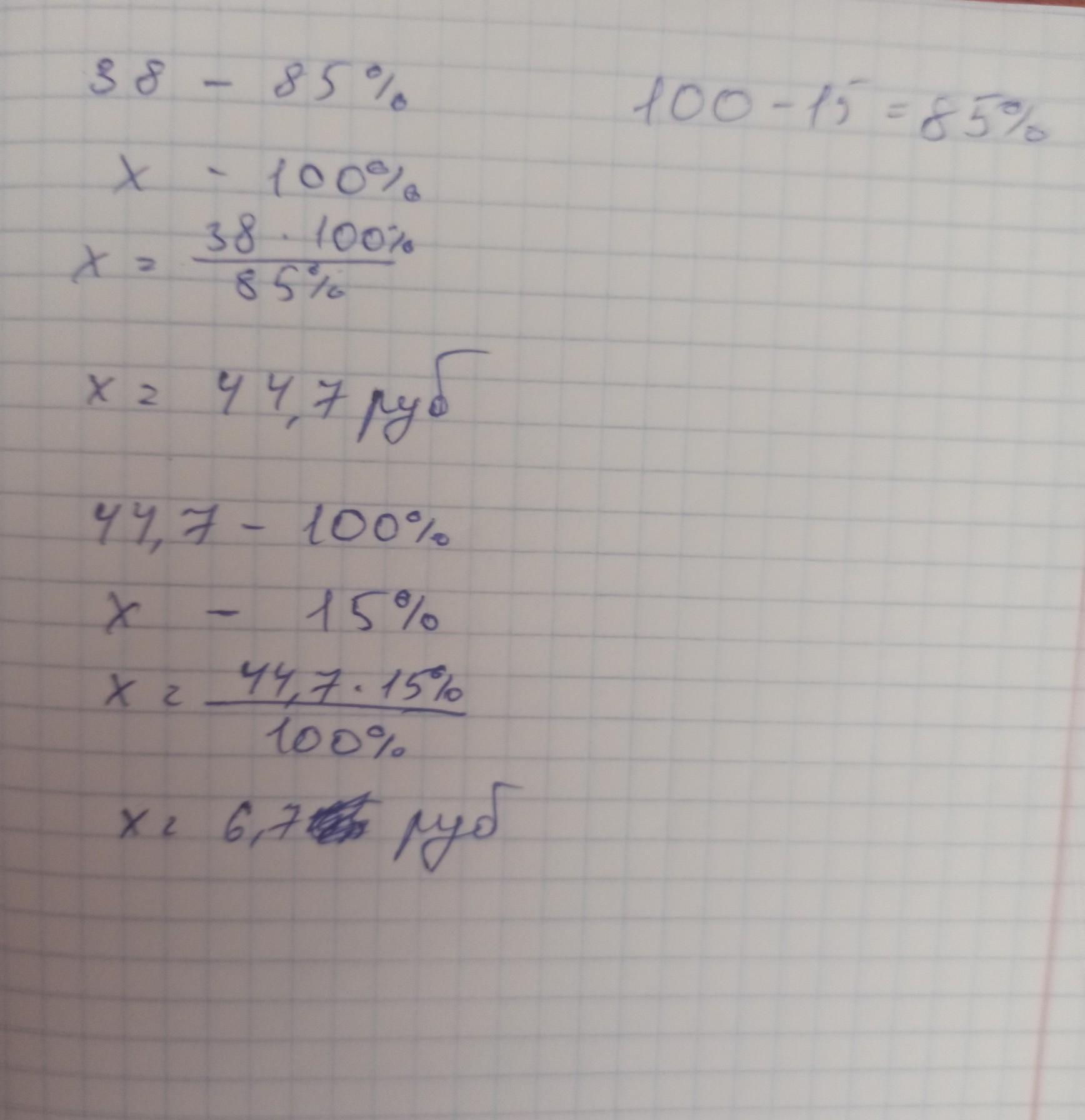 скидка 15%, значит цена 85% от 100%, 100%=38, 85%=х
