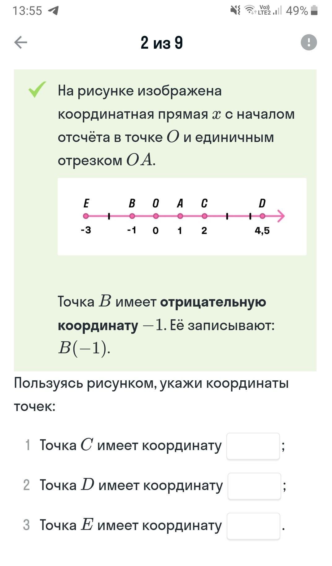 Точка С имеет координату 2, точка D имеет координату 4,5, точка Е имеет координату (-3)