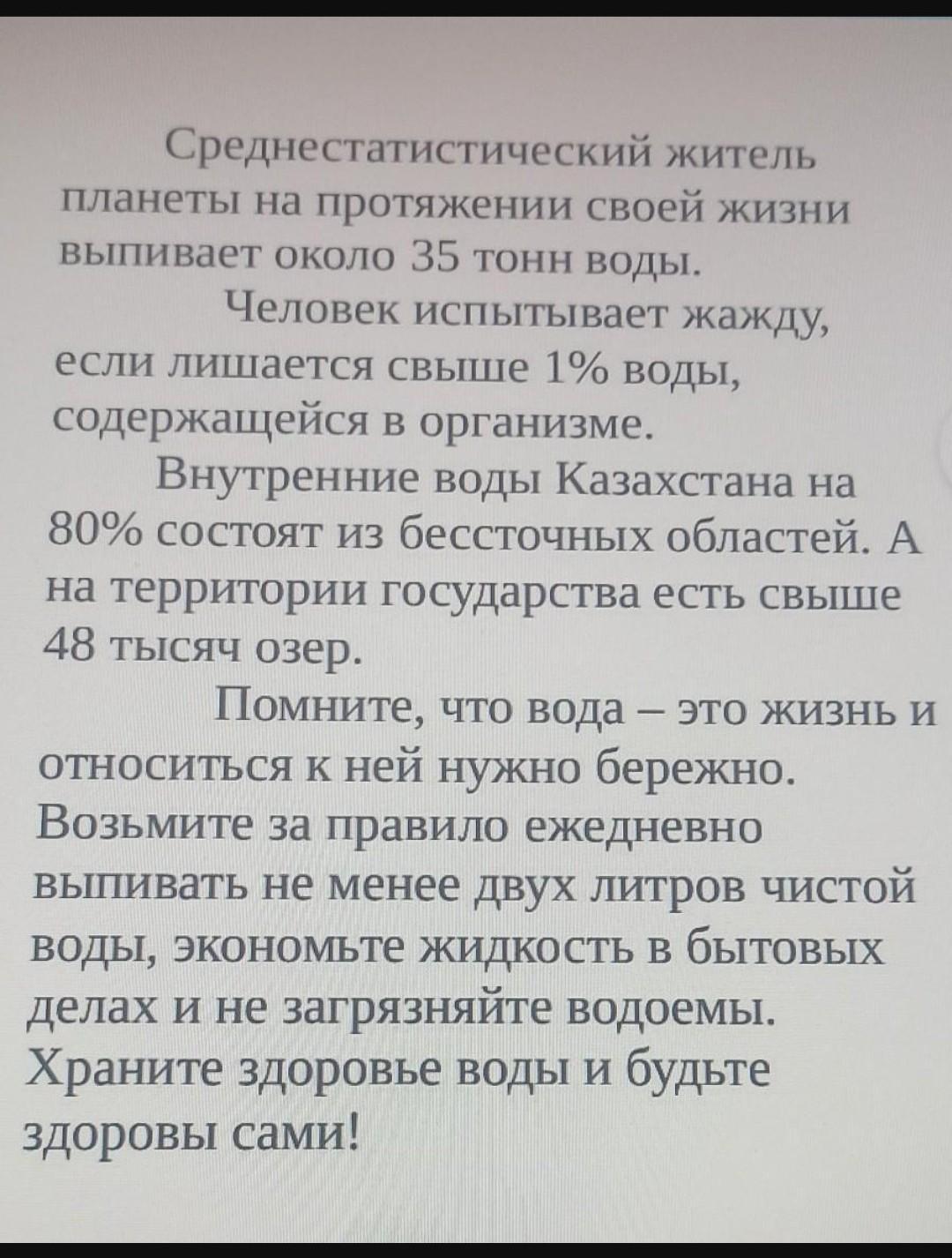 2. Мы должны помнить, что вода - это жизнь и что мы должны относиться к ней бережно. Люди должны взять за правило ежедневно выпивать не менее двух литров чистой воды, экономить жидкость в бытовых делах и не загрязнять водоемы. Мы должны хранить здоровье воды и быть здоровы сами!