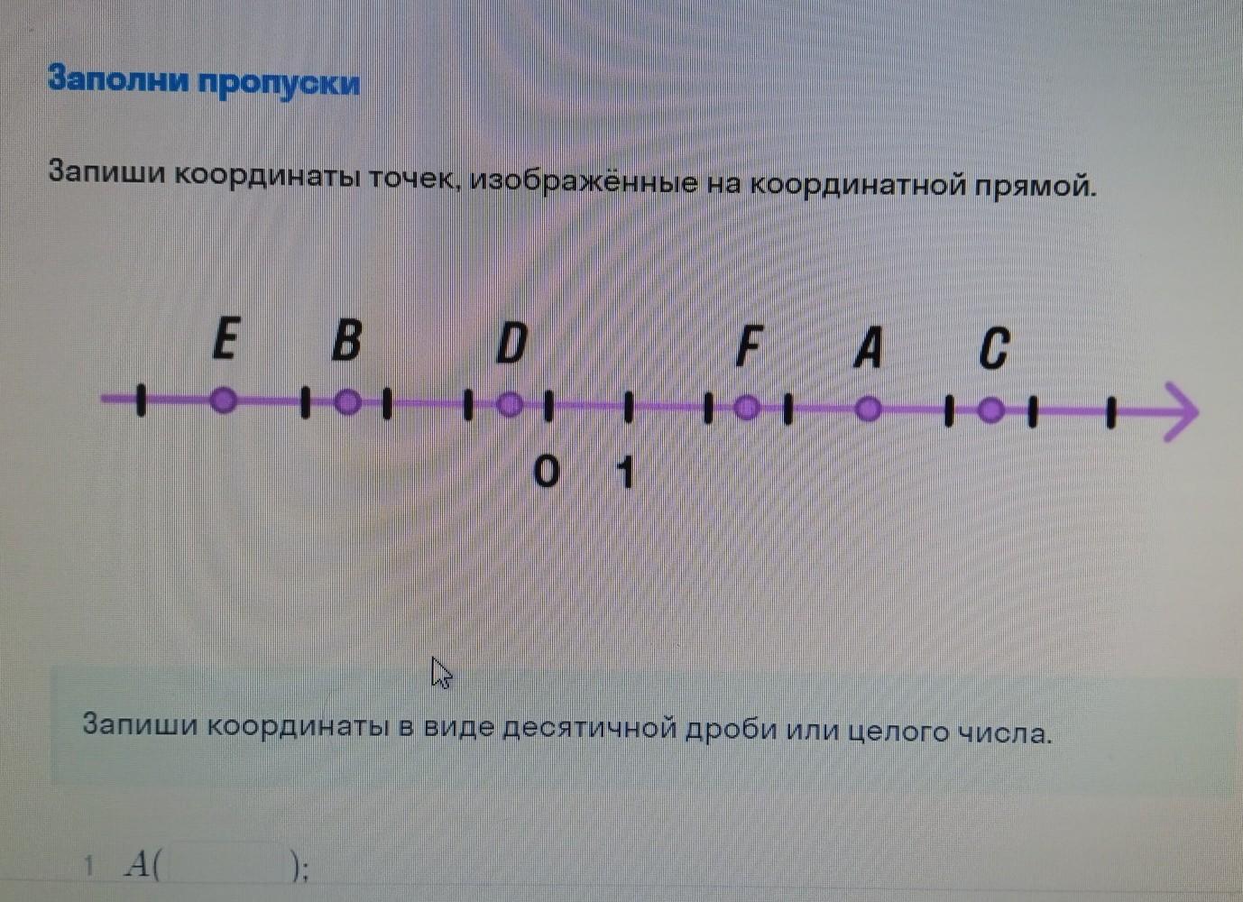 срочно!Заполни пропуски Запиши координаты точек изображённые на координатной прямой E B o 1 D о! 1 o 1 F о! А с ТО Запиши координаты в виде десятичной дроби или целого числа