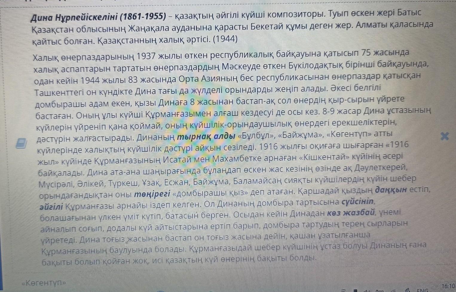 Қазақтың күйші қызы Мәтінді оқы. Динаның ең алғашқы күйін көрсет. «Көгентүп»