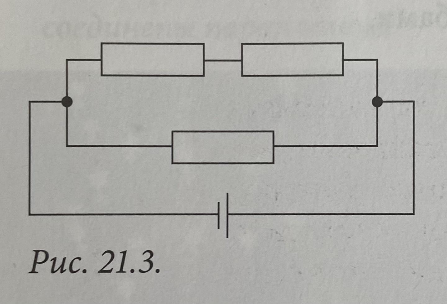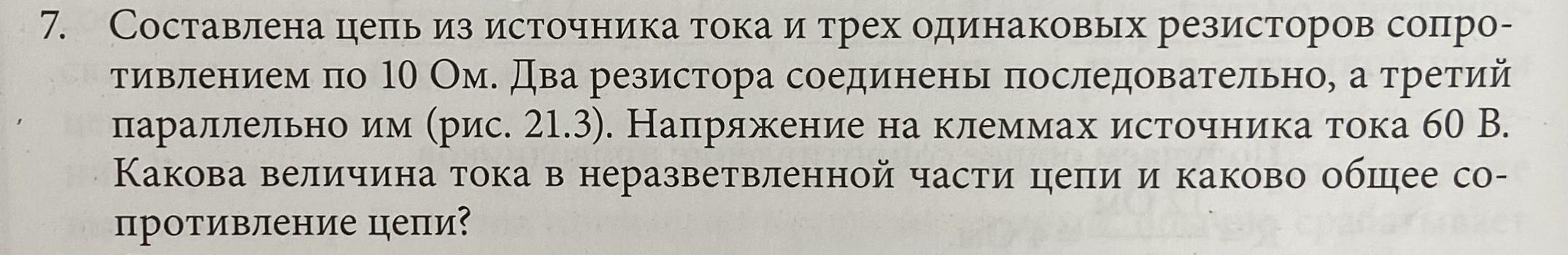Составлено цепь из источника тока и трёх одинаковых резисторов сопротивлением по 10 Ом. Два резистора соединены последовательно, а третий параллельно им) рис. 21.3) Напряжение на клеммах источника тока 60 в. Какова величина тока в неразветвленной части цепи?