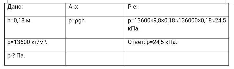 В цилиндр налита ртуть,высота столба которой 0,18 м. определите давление ртути на дно цилиндра если плотность ртути 13600кг/м3