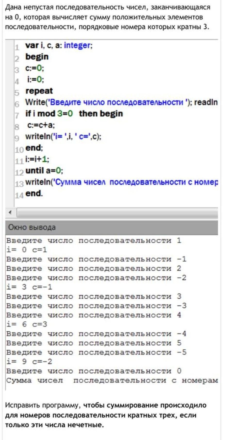 writeln('Сумма нечётных чисел последовательности с номерами кратными 3 ',c)