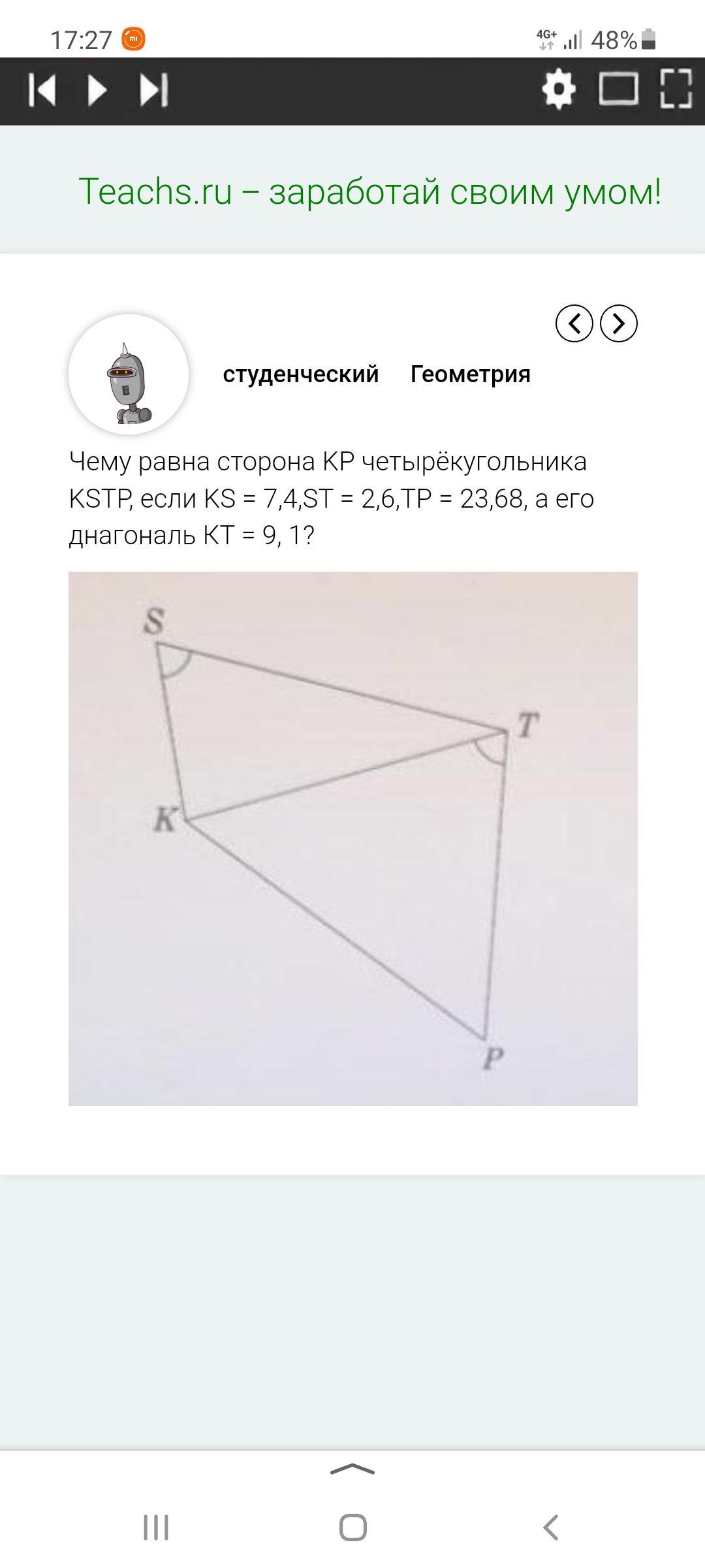 Чему равна сторона KP четырехугольника KSTR, если KS = 7,4 , ST= 2,6, TP=23,68, а его диагональ KT= 9,1 ?