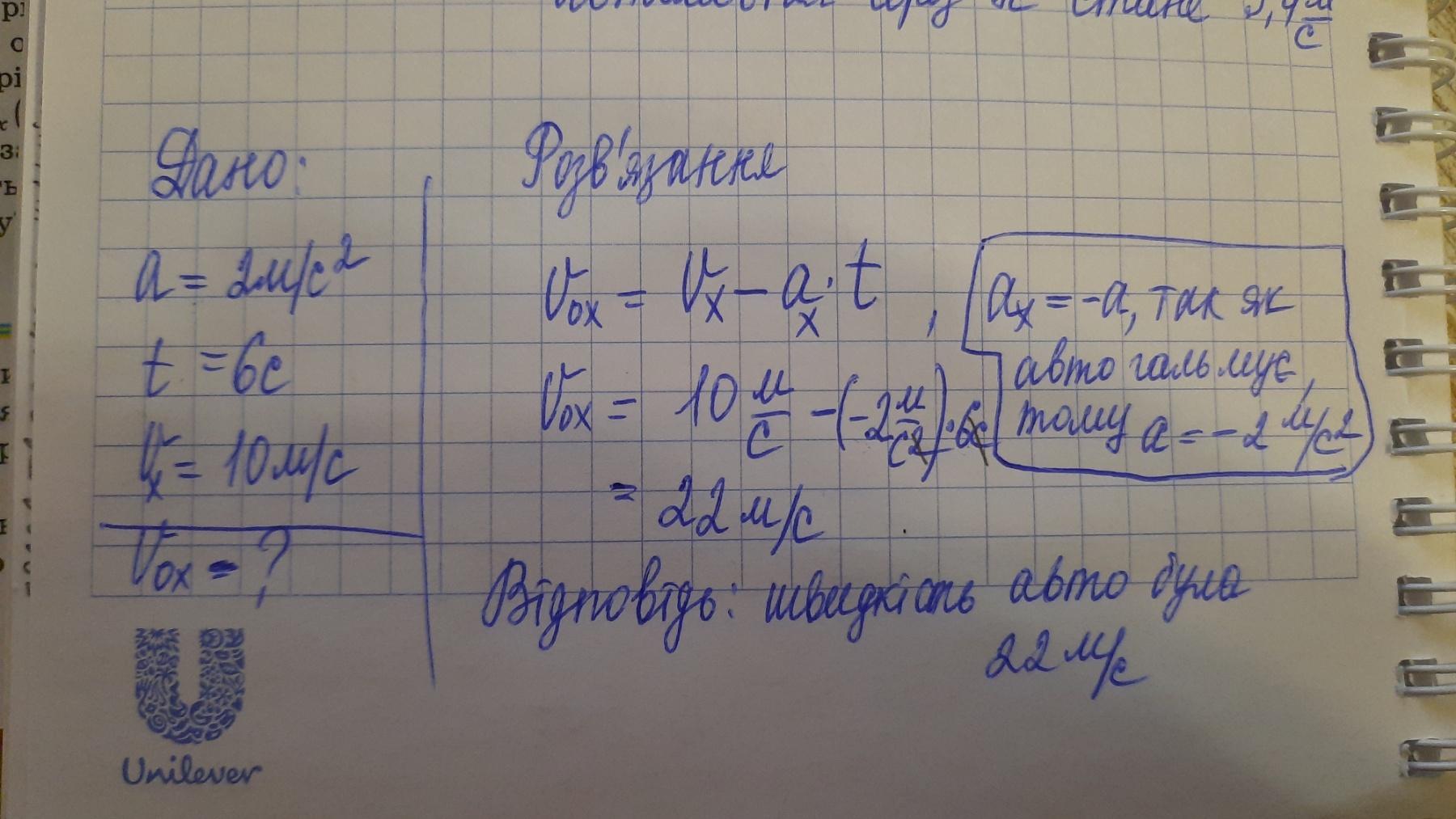 Прискорення автомобіля під час гальмування дорівнює 2 м/с^2. Якою була початкова швидкість його руху якщо через 6 с. швидкість руху стала 10 м/с?